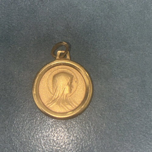 18K YELLOW GOLD SENORA LADY OF LOURDES SMALL 9mm ROUND MEDAL VIRGIN MARY MADONNA